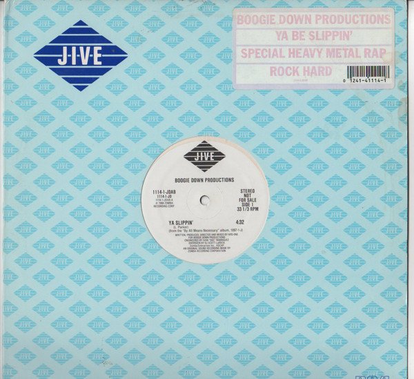 Sticker on cover with text: ‘Boogie Down Productions – Ya Be Slippin – Special Heavy Metal Rap – Rock Hard’ including Cat# / Barcode