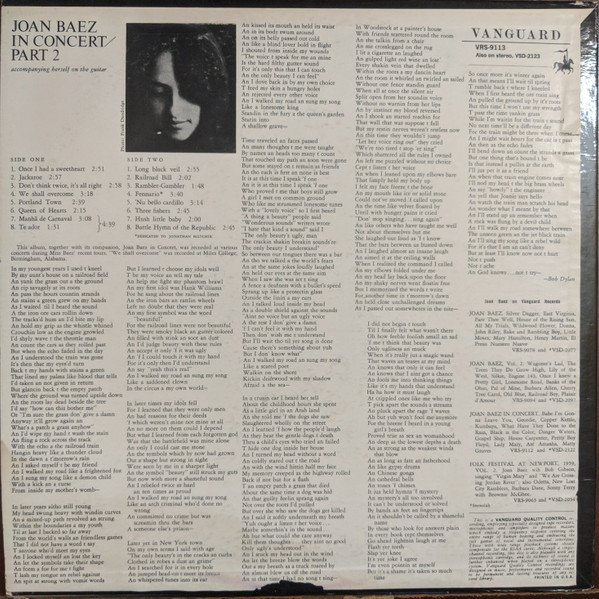 “This album together with it’s companion, Joan Baez in Concert, was recorded at various concerts during Miss Baez’ recent tours. ‘We Shall Overcome’ was recorded at Miles College, Birmingham, Alabama.”