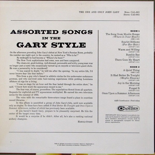 Also available Mono [url=http://www.discogs.com/John-Gary-The-One-And-Only/release/2487037]CAL-983[/url]